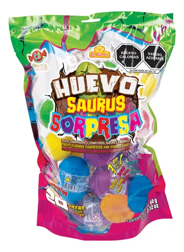 “Grajea confitada con sobres de sabores frutales (cada huevo contiene dulces, juguete + tatuaje)”